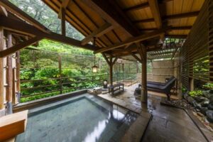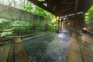 那須高原に佇む「こころのおやど 自在荘」の露天風呂は、森に包まれるような開放感が魅力。